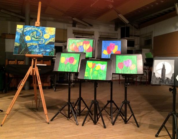 Doch im Forum und auf der Bühne gab es noch viel mehr zu sehen: Die Schülerinnen und Schüler der Klassen 8, 9 und 10 präsentierten Acrylbilder, Zeichnungen und Masken, die sie während der letzten Wochen und Monate erstellt hatten. Von Tulpenbildern aus Acryl bis hin zu hölzernen Wanduhren gab es viel zu bestaunen. Die Kunstwerke, die in Einzel- oder Gruppenarbeit angefertigt worden waren, wurden auf Notenständern präsentiert. So konnte die wichtige Verbindung zwischen dem Musik- und Kunstbereich (MK) der CRRS optimal in Szene gesetzt werden.